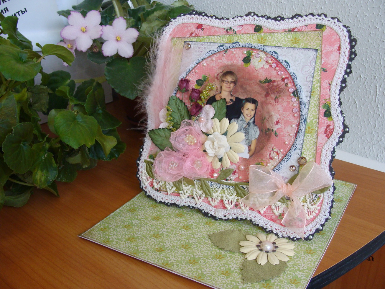 Вот такую открыточку-стойку я сделала на заказ к 8 марта, с поздравлениями и для мамы, и для её дочки.